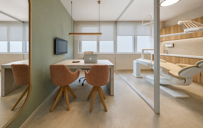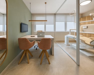 A proposta parte dos princípios da arquitetura biofílica, aplicada de forma sutil e estratégica para reduzir o estresse associado ao atendimento odontológico e promover sensações de calma, segurança e confiança. A presença de elementos naturais, o uso equilibrado da iluminação e a paleta cromática inspirada na natureza — com tons de verde, terracota e madeira — criam ambientes visualmente leves, acolhedores e emocionalmente confortáveis.